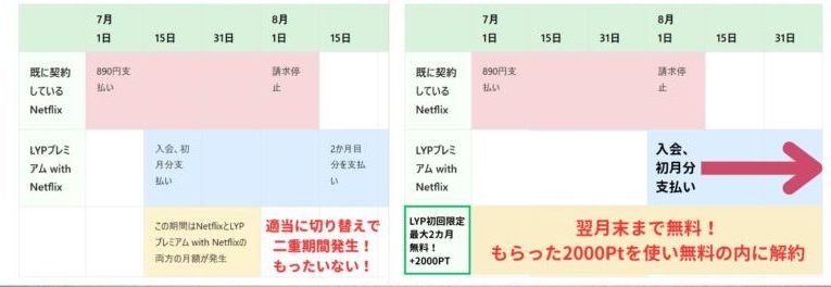 新プランにそのまま移行しようとすると、期間によっては二重登録期間が生まれて損します。さらに、LYP新規登録ではなくなるため2000円分の特典がもらえない恐れがあります。