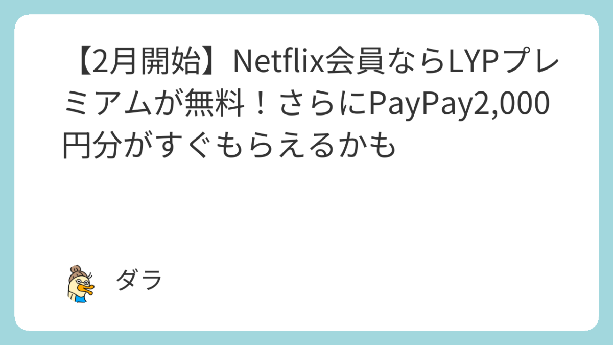 2026年2月から、Netflix会員向けに LYPプレミアムの特典が使える新プランが開始予定 と発表されています。 今までと同じ、Netflixの980円だけでLYPの特典も使えちゃうからお得だと話題なっていますね。ただし、注意を読んだら契約方法によっては損しちゃうことも。