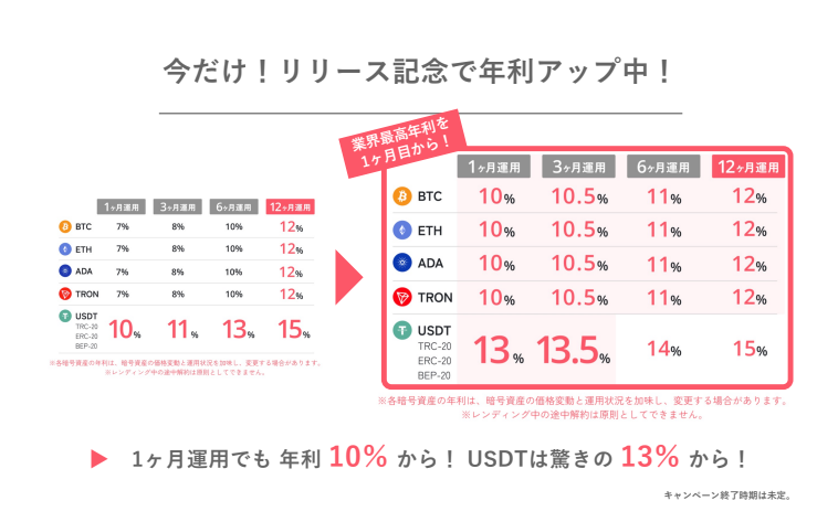 私が参加した時は5万円以内から最低金額のレンディングができましたが、相場変動により条件は変わるため、最新情報を確認してからスタートしましょう。