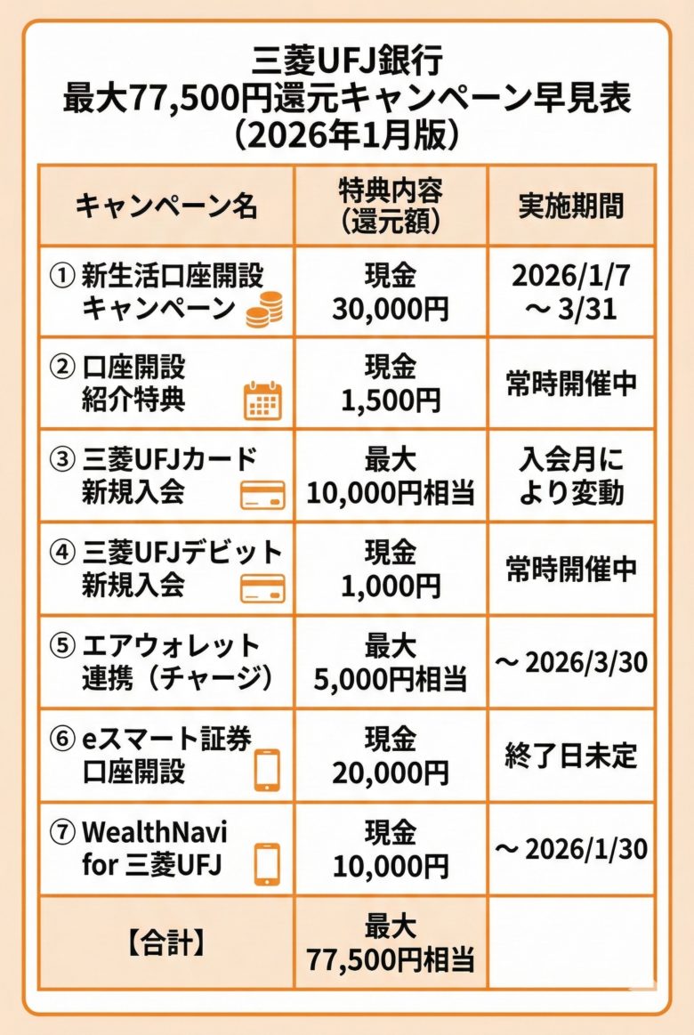 三菱UFJ銀行で最大77,500円分キャンペーン